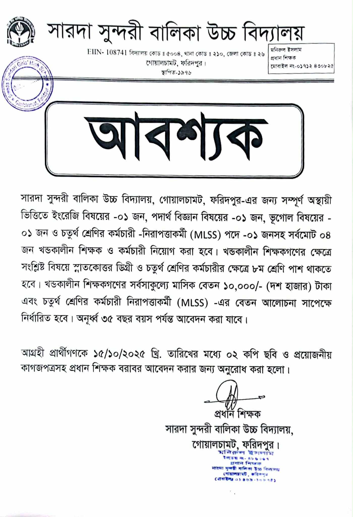 খণ্ডকালীন শিক্ষক-কর্মচারী নিয়োগ বিজ্ঞপ্তি।